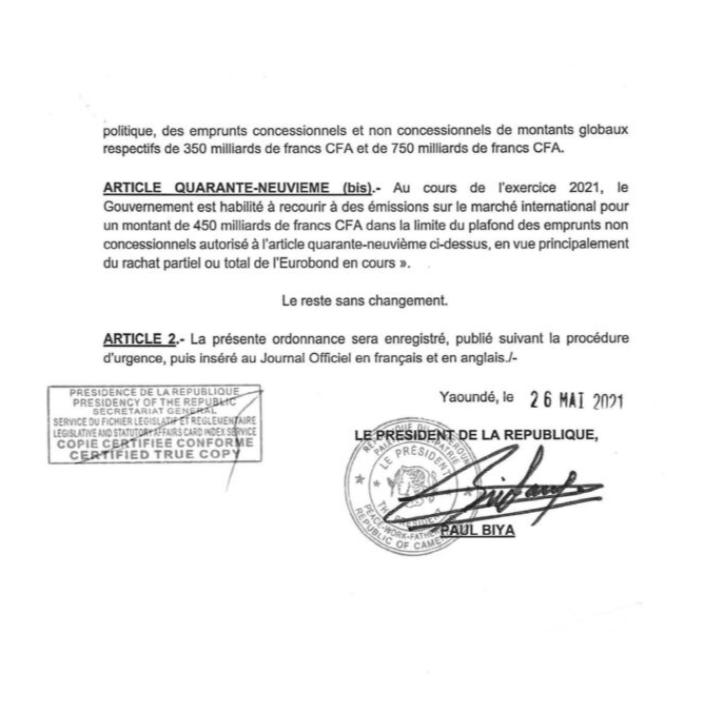 Article quarante-neuvième (bis) : » Au cours de l’exercice 2021, le gouvernement est habilité à recourir à des émissions sur le marché international pour un montant de 450 milliards de FCFA, dans la limite du plafond des emprunts non concessionnels, autorisé à l’article 49ème ci-dessus, en vu principalement du rachat partiel ou total de l’eurobond en cours « .