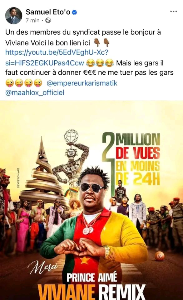 Moins de 24 h après la sortie du remix du « continent » de « Viviane », les Camerounais, dans leur immense majorité ont demandé à Samuel Eto’o, l’icône du football africain, de partager le lien de la vidéo sur ses pages. L’objectif est de booster le nombre de vues afin d’atteindre le challenge de 5 millions de vues en 24 heures lancé depuis le lundi 4 novembre 2024, date de la sortie du remix de la chanson « Viviane ».